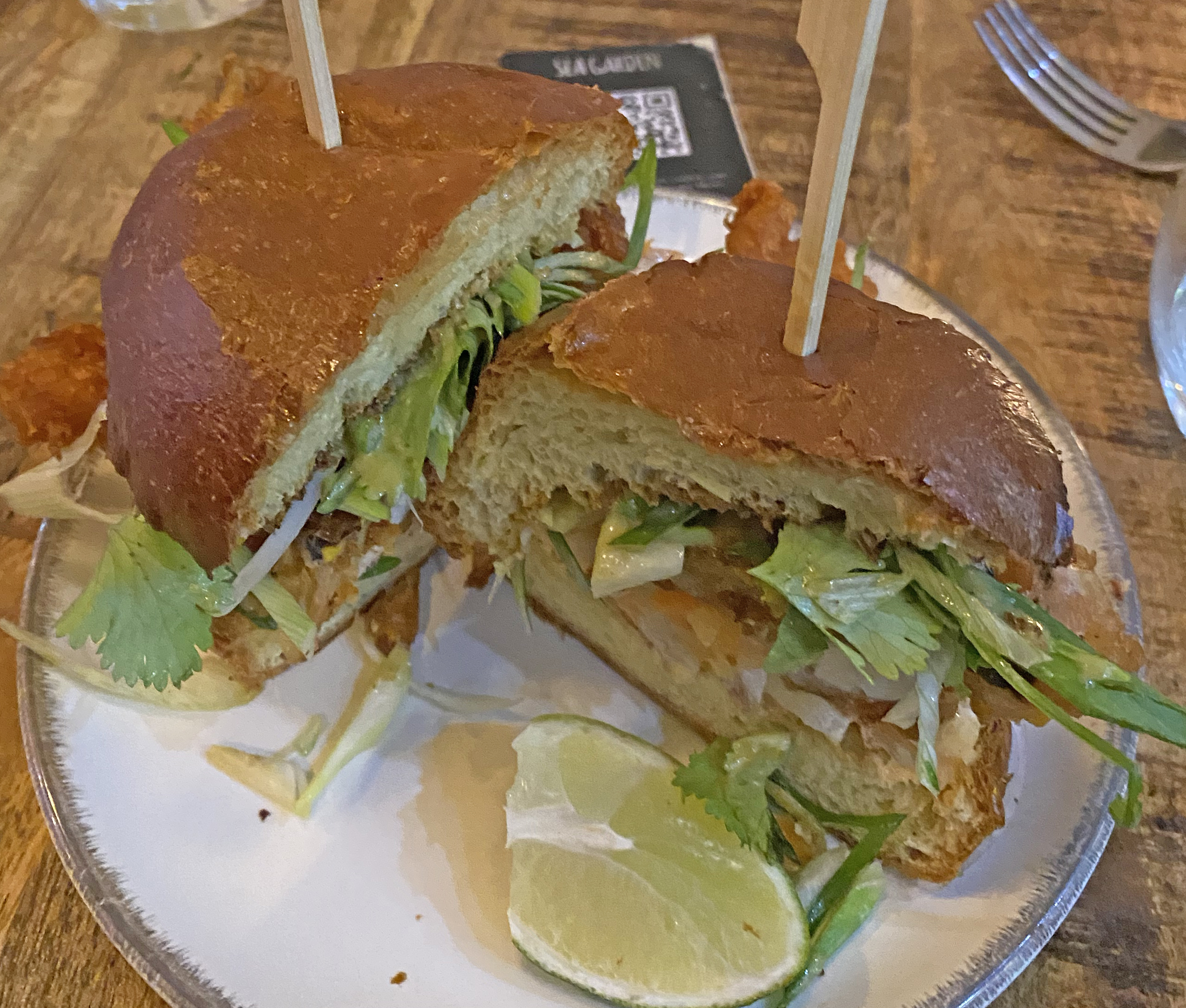 We also chose a Red Man burger (buttermilk chicken with a spiced Mac sauce, red cabbage, red onion, scotch bonnet chilli and coriander slaw). We were a bit doubtful about the scotch bonnet hiding all the flavour, but we had nothing to worry about. We got an occasional hit and there was more in the middle but that was fine as we had built up our tolerance. This was a great crunchy, chicken and several of our veggie portions. We also needed the water and lemon for this too.