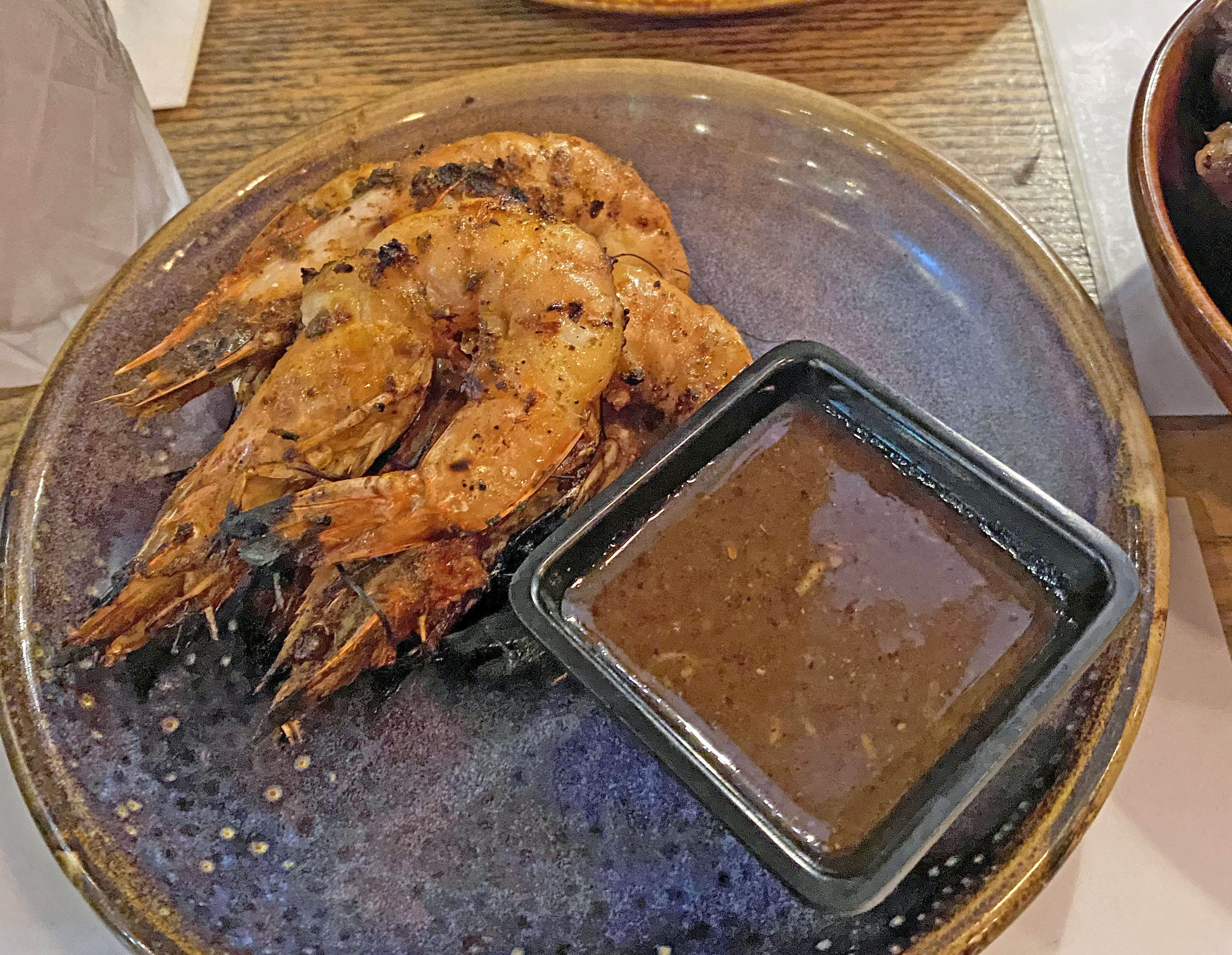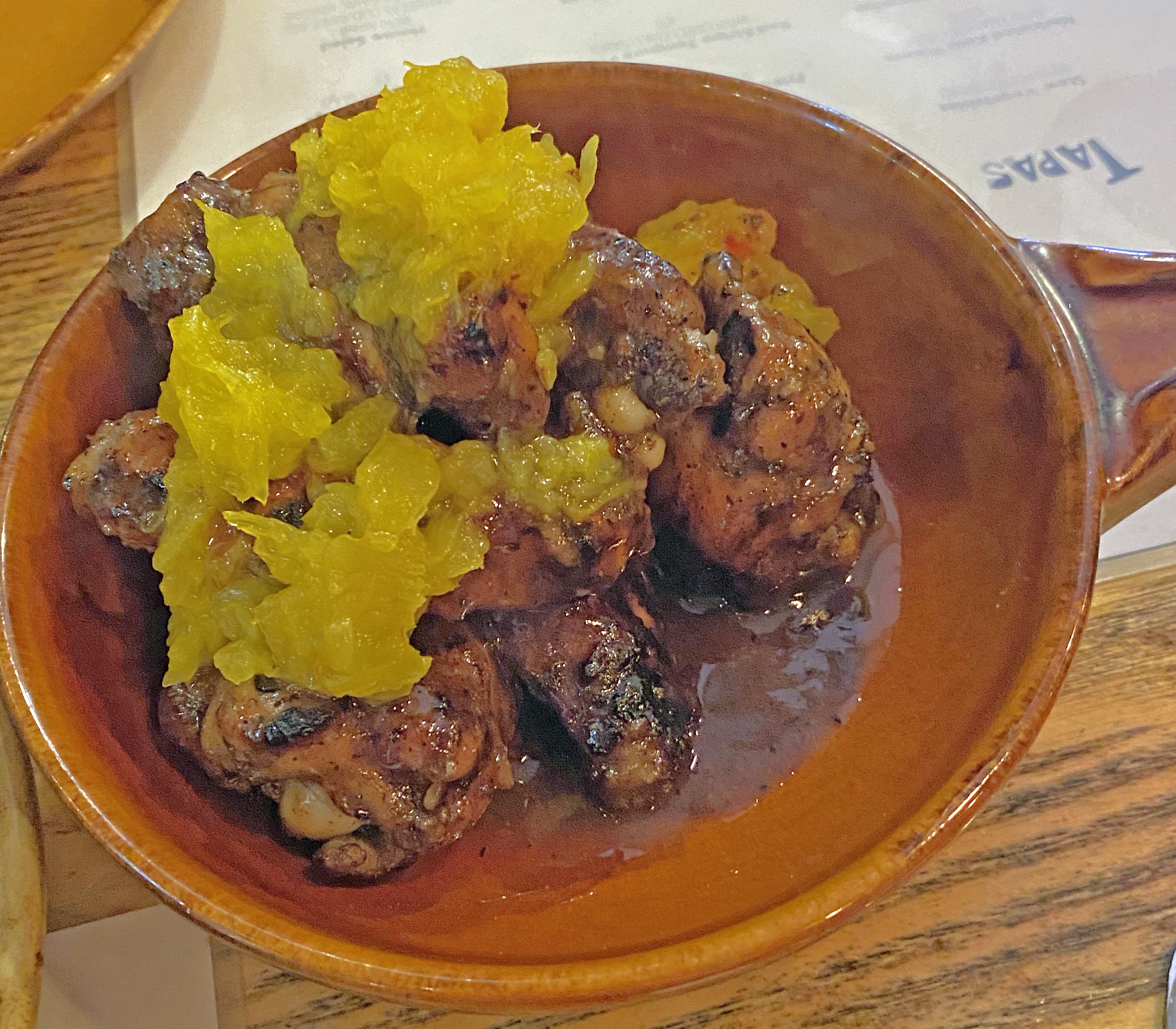 Nothing was too hot but the chili or the pepper added a lovely warmth. The wings were just right, meat falling off the bone and the guava adding a foil for the barbecue sauce. We were delighted to find that we didn’t have to pick our way over the prawns as someone had thoughtfully removed the middle part of the shell. The tamarind sauce was spicy so only a little was needed to prevent the prawn being overwhelming but it was good to dip the chips into.