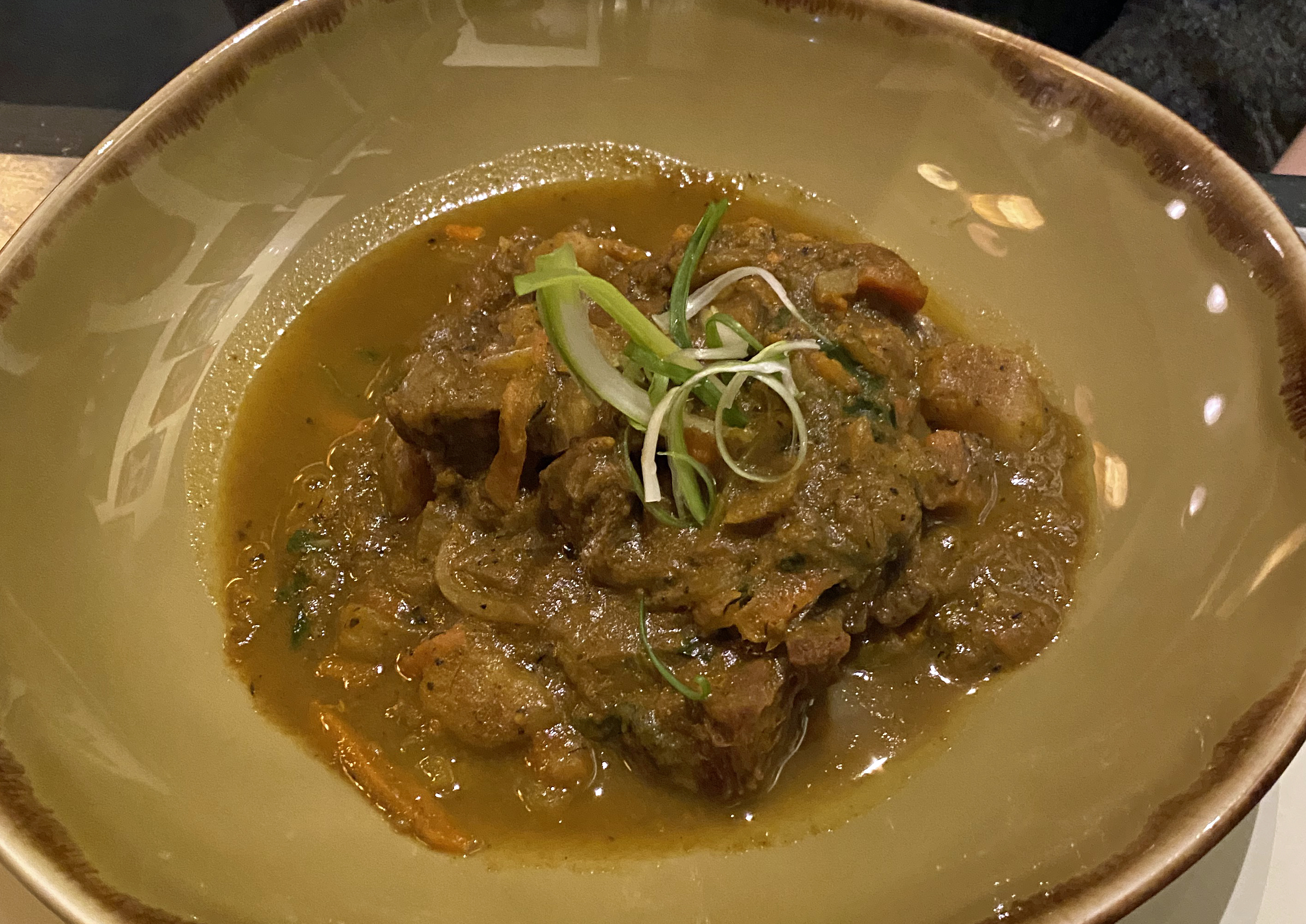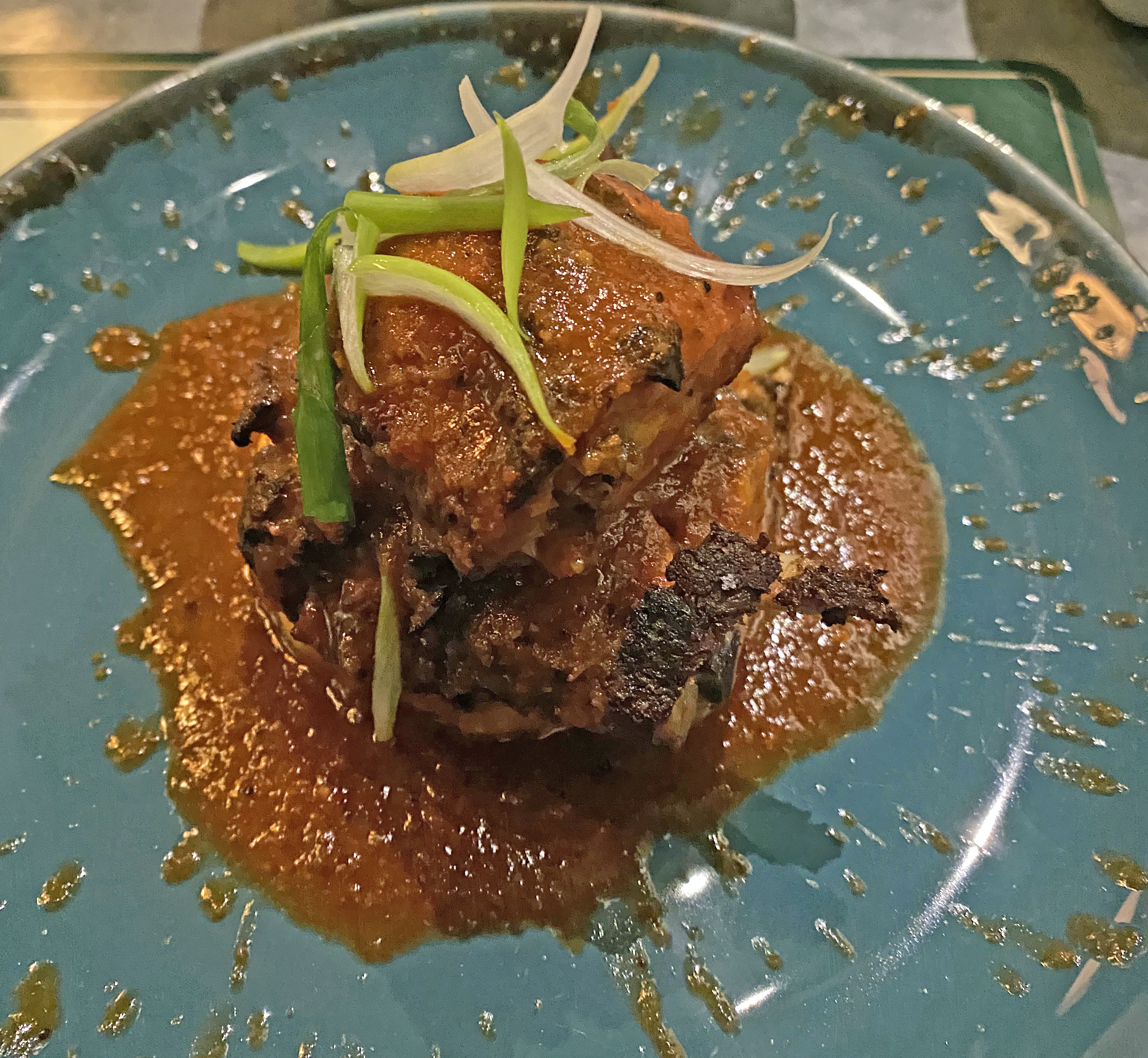 Nothing was too hot but the chili or the pepper added a lovely warmth. The wings were just right, meat falling off the bone and the guava adding a foil for the barbecue sauce. We were delighted to find that we didn’t have to pick our way over the prawns as someone had thoughtfully removed the middle part of the shell. The tamarind sauce was spicy so only a little was needed to prevent the prawn being overwhelming but it was good to dip the chips into.
