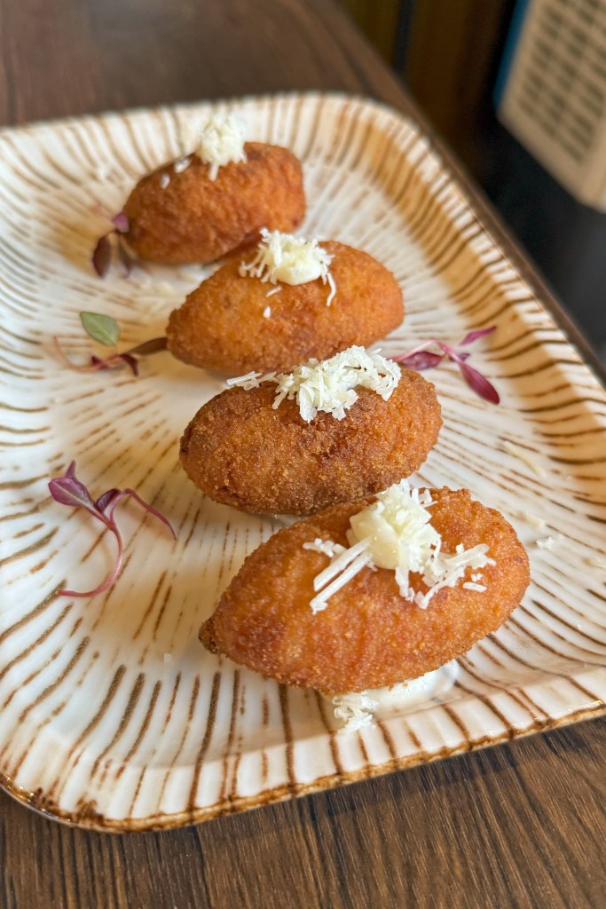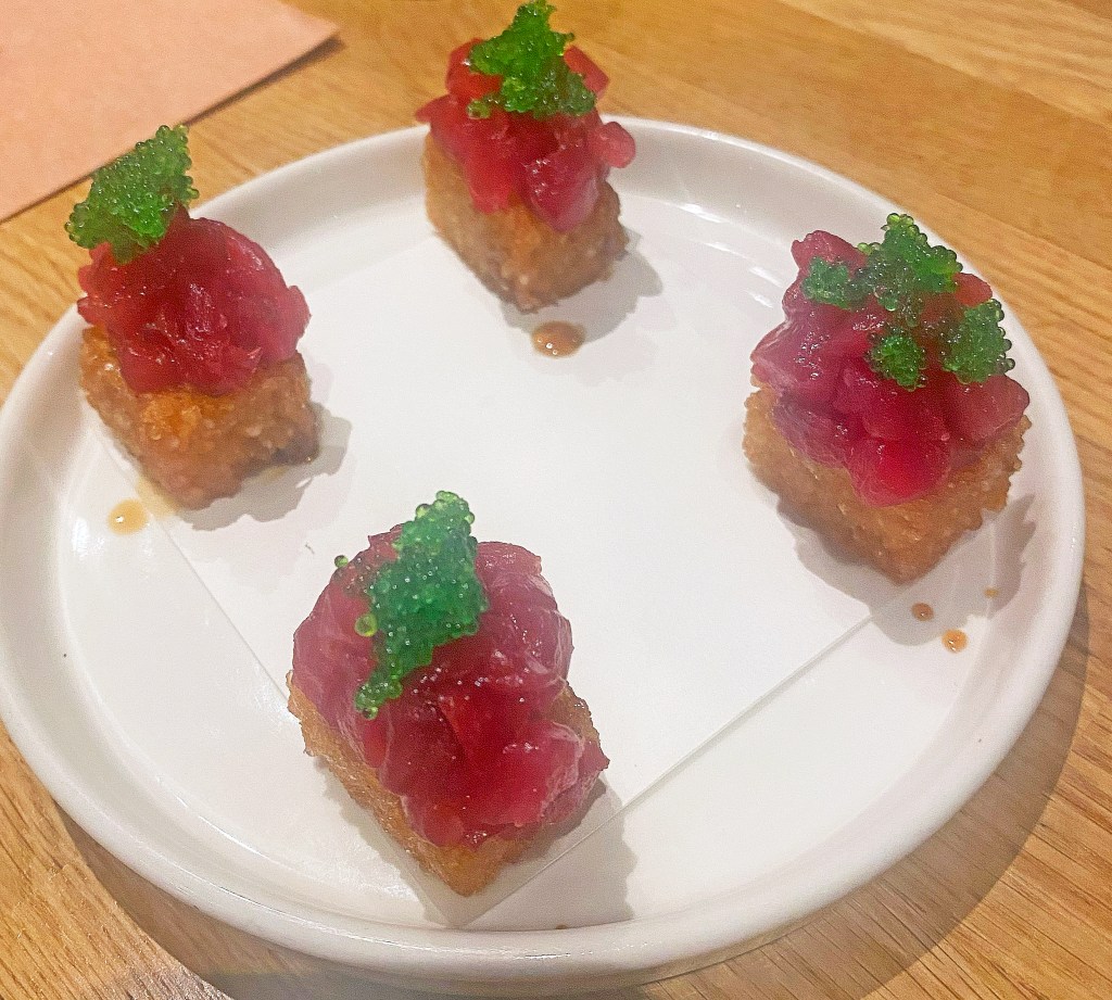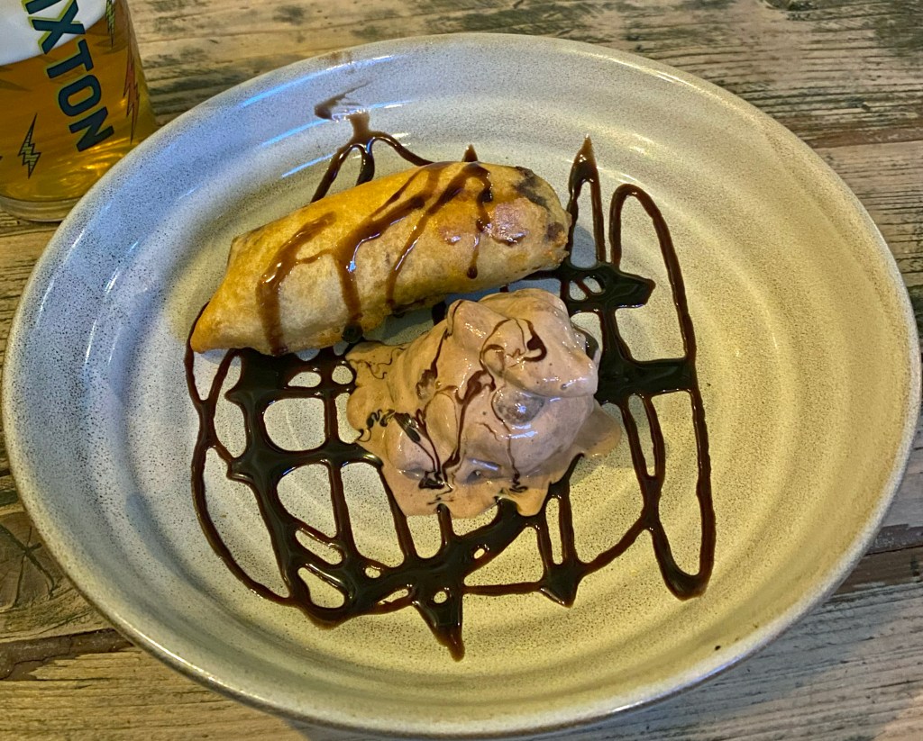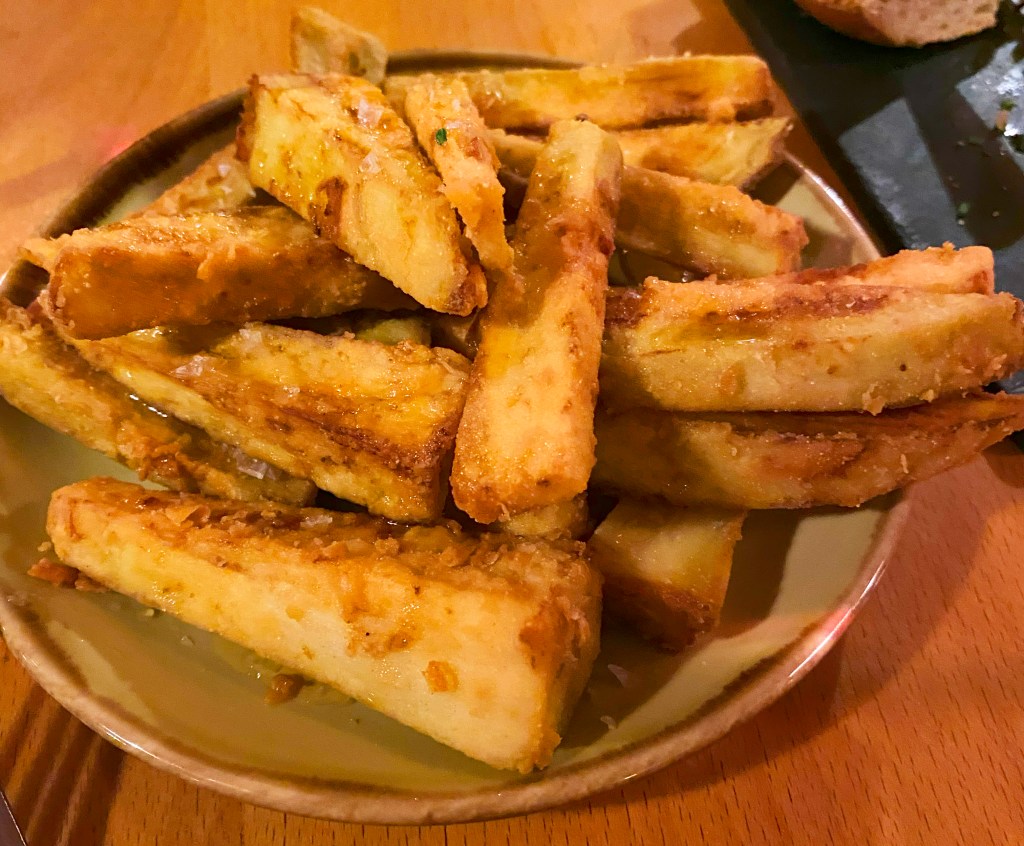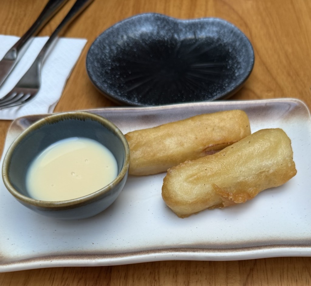 Now we come to the desserts which look incredibly exciting. There’s Sichuan ice jelly, Mango pomelo sago, brown sugar rice cake and our chosen dish to share – Deep Fried Milk. It is crispy fried somethings to dip into condensed milk. Very sweet but very delicious.